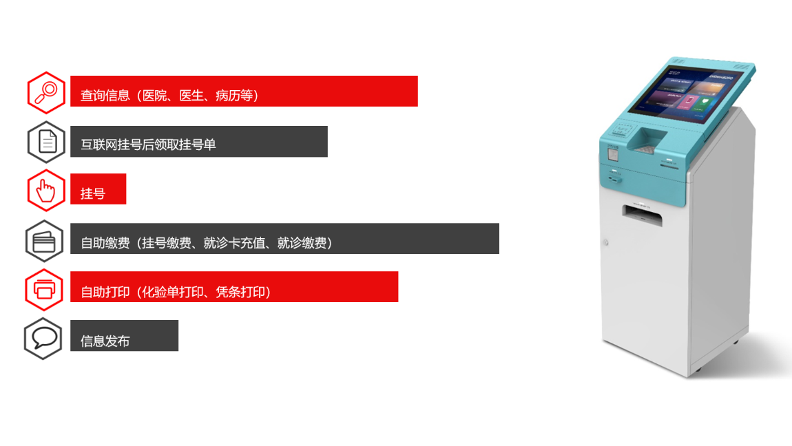 医疗自助机是现代医疗服务的一大创新,它集成了多项便捷功能,包括挂号预约、费用缴纳、检验报告打印等,极大地简化了患者的就医流程。患者只需简单几步操作,就能迅速完成就医前的各项准备,无需长时间排队等待,既节省了宝贵的时间,又提升了就医的整体体验。同时,医疗自助机的广泛应用也促进了医院服务效率的提升,为患者提供了更加高效、便捷的医疗服务,是现代医疗信息化发展的重要成果。。